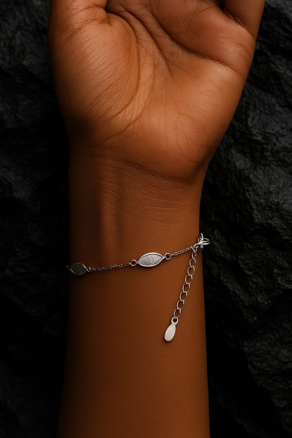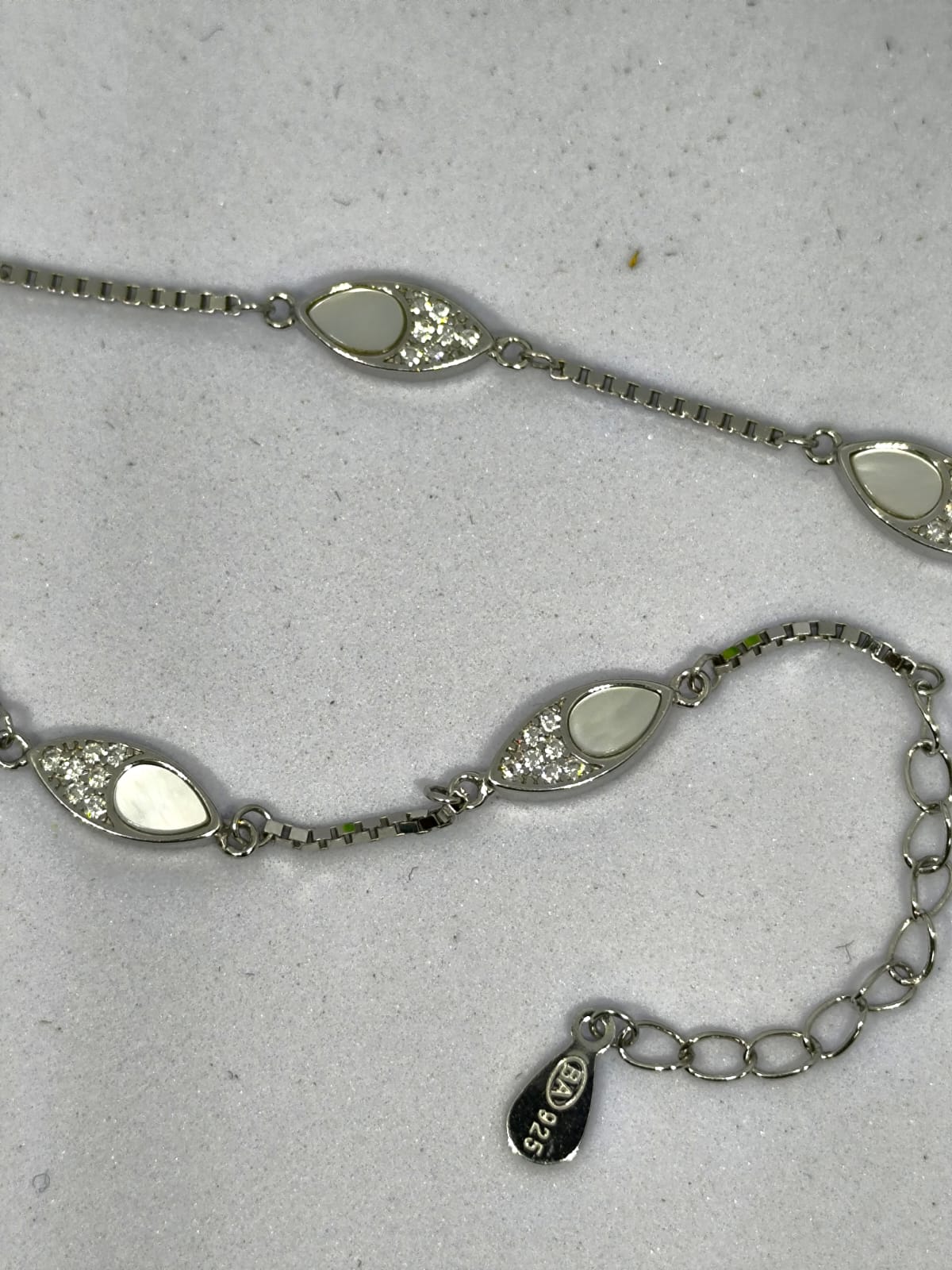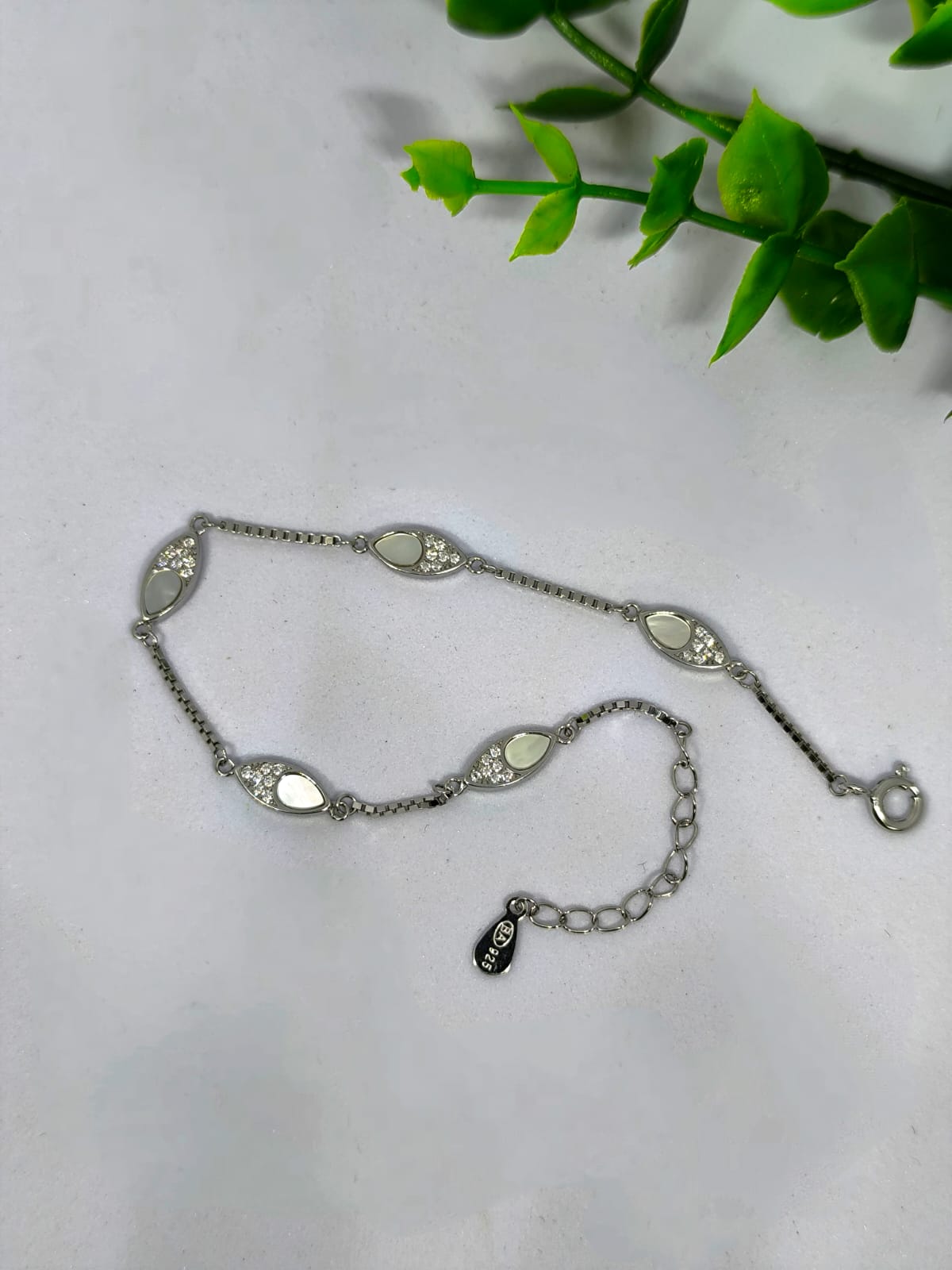 Luminous 925 silver bracelet with marquise links, mother‑of‑pearl inlays and pavé crystals. Fluid box connectors, secure lobster clasp, adjustable extender—refined, versatile shine for everyday layering and special occasions.