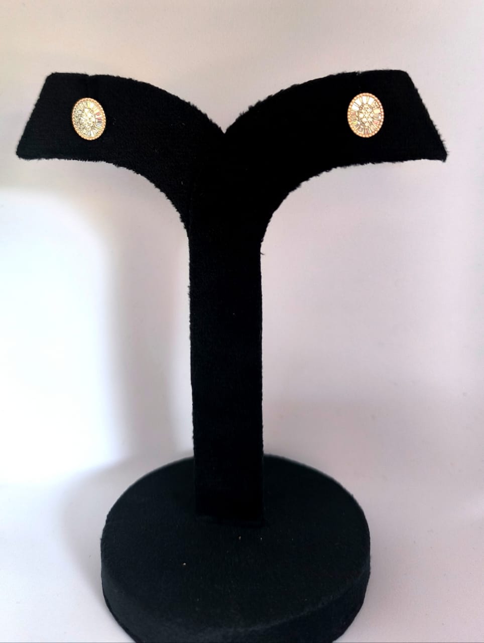 Step into refined luxury with Regalia Radiance, a stunning pair of earrings from ZATRA COLLECTIONS that celebrates the harmony of tradition and modern elegance. The face of each earring is adorned with a radiant rose gold finish, encrusted with shimmering stones that catch the light with every movement. Surrounding the central sparkle is a halo of baguette-cut brilliance, framed by a delicate beaded rim that adds depth and opulence.